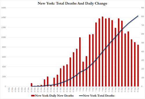Update (1140ET): New York Gov. Andrew Cuomo just gave the world one more reason to celebrate, as US stocks head back into the green, as he reported fewer than 500 deaths in New York State - a state that's been home to nearly half of the nation's deaths - over the last 24 hours.