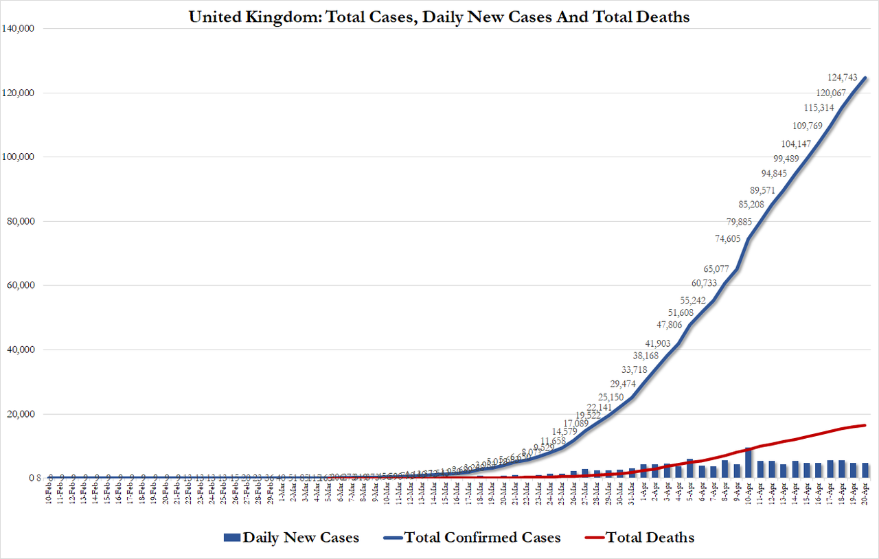 Update (1330ET): Italy reported 2,256 new cases of coronavirus and 454 new deaths over the last 24 hours on Monday, for a total of 181,228 cases and 24,114 deaths. While the country saw a slight rise in deaths day over day, the number of new cases (along with the total number tested) declined, as did the number of patients hospitalized, and the number of patients intubated. Meanwhile, in the UK, officials reported 4,676 new cases of coronavirus and 449 new deaths, for a total of 124,743 cases and 16,509 deaths.