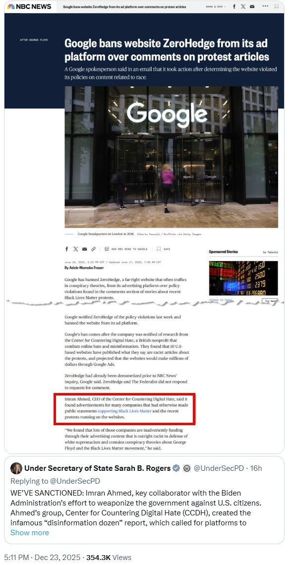 Today, the United States issued SANCTIONS reinforcing the "red line" I invoked on @GBNEWS. Namely: extraterritorial censorship of Americans.