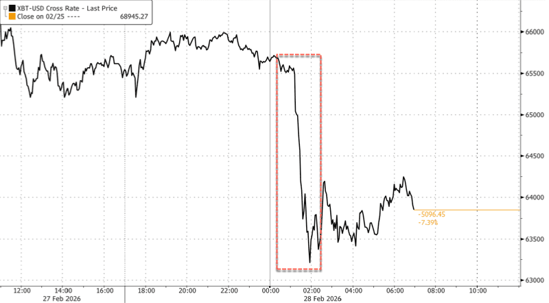 In markets, with Brent crude futures closed, Bitcoin was hammered from the $65k level, down to the $63k level.