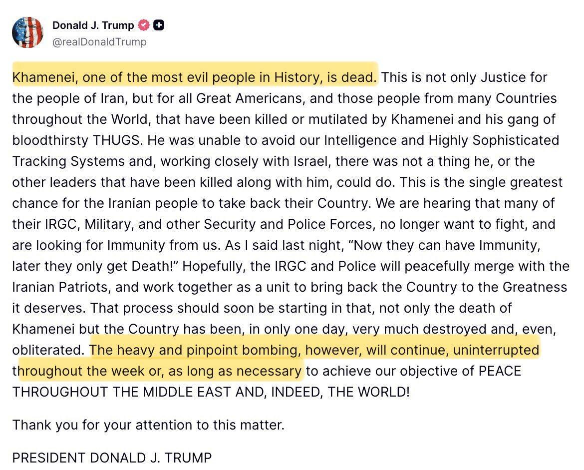 Iranian state TV confirms the Supreme Leader's death... as well as the deaths of his daughter, son-in-law, grandson, and daughter-in-law.