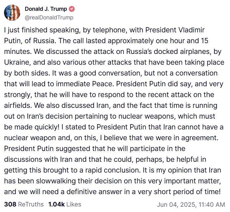 The fresh Truth Social statement was further taken up with Iran. "I stated to President Putin that Iran cannot have a nuclear weapon and, on this, I believe that we were in agreement. President Putin suggested that he will participate in the discussions with Iran and that he could, perhaps, be helpful in getting this brought to a rapid conclusion," he wrote.