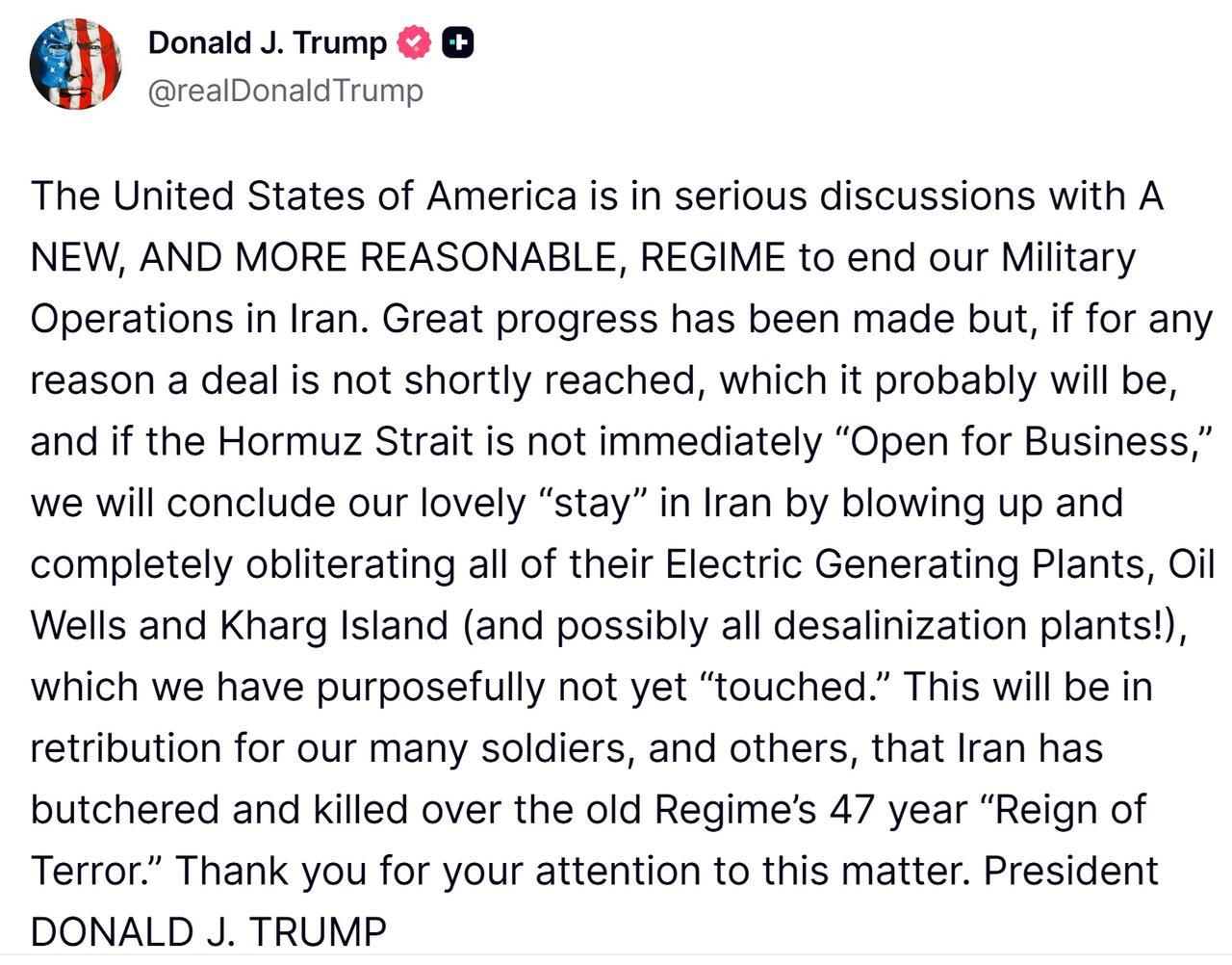 Iran rejects 'excessive, illogical' US demands while Trump mentions 'progress' with a 'more reasonable regime'. Trump again threatens to destroy Iran energy sites and Kharg Island.