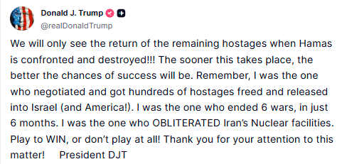 President Trump on Monday issued a scorching message aimed at Hamas as well as the growing internationall and domestic critics of America's Israel policy. He called for the total destruction of Hamas and the return of the hostages, in that order.