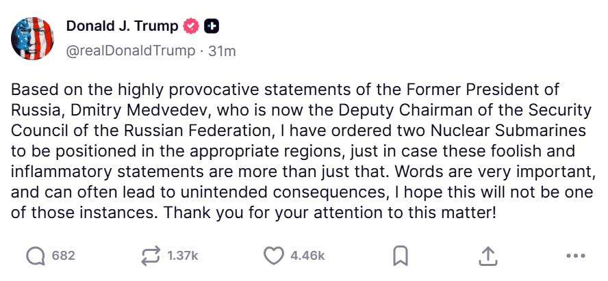 Trump Issues Further Explanation On Moving 2 Nuclear Submarines 'Closer To Russia'