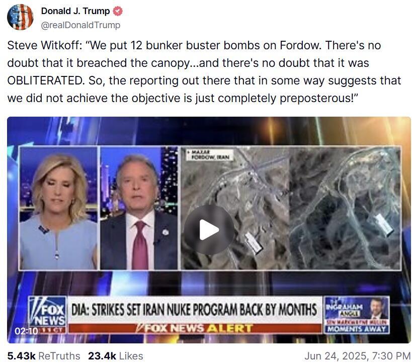 Trump, Rubio, and Hegseth are in Europe proclaiming the 'overwhelming success' of the strikes: