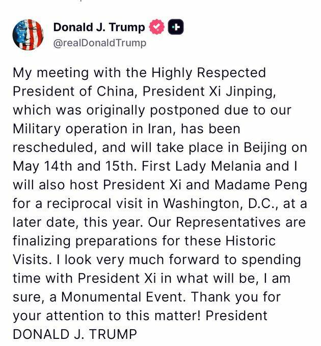 Trump’s meeting with Xi in China will now take place in Beijing on May 14–15. pic.twitter.com/6kfu8xMCTp
