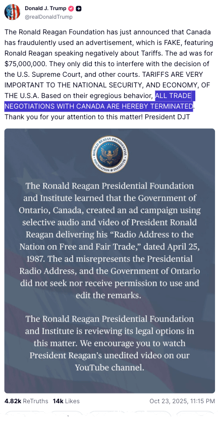 Late Thursday night, President Trump wrote on Truth Social, "The Ronald Reagan Foundation has just announced that Canada has fraudulently used an advertisement, which is FAKE, featuring Ronald Reagan speaking negatively about Tariffs."