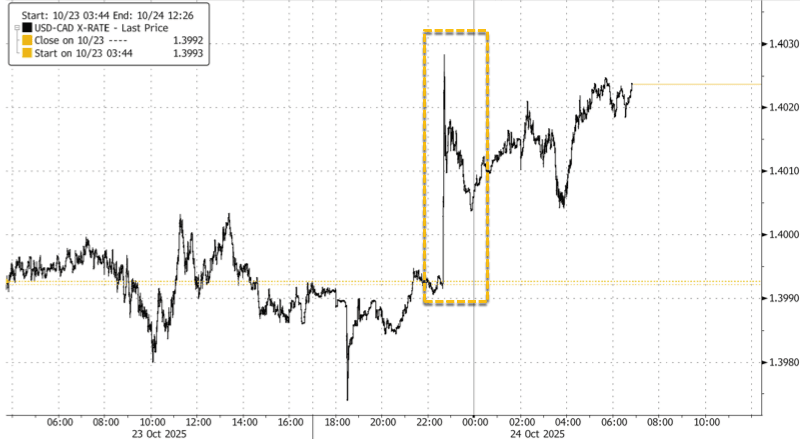 In markets, UBS analyst Jason Poh told clients that "USDCAD has a knee-jerk jump, 30+ pips" after Trump announced all trade talks were terminated.