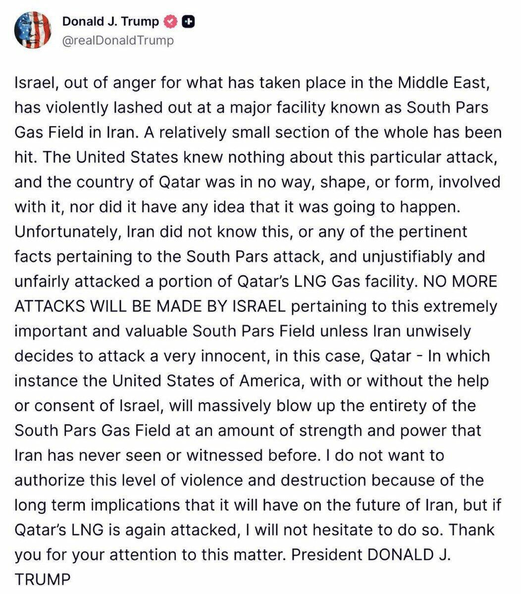 Then came the kicker: "In which instance the United States of America, with or without the help or consent of Israel, will massively blow up the entirety of the South Pars Gas Field at an amount of strength and power that Iran has never seen or witnessed before," he wrote.