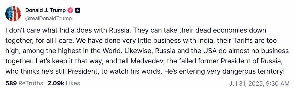 Medvedev had warned Tuesday in the wake of Trump reducing a deadline for Russia to agree a Ukraine peace settlement down to ten days that "Russia isn't Israel or even Iran" and so "Each new ultimatum is a threat and a step towards war. Not between Russia and Ukraine, but with (Trump's) own country."