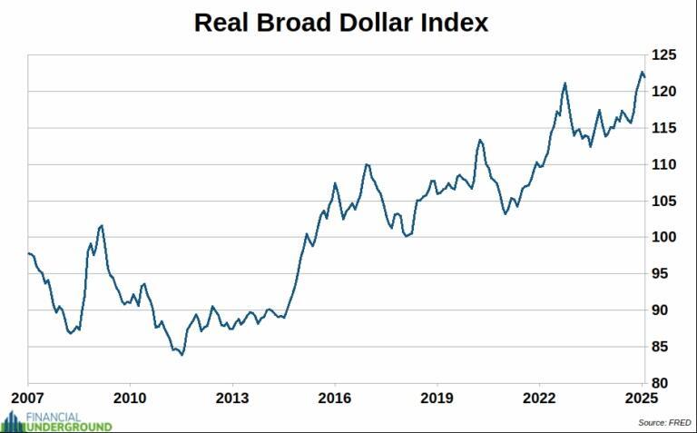 The Real Broad Dollar Index tracks the dollar’s value against a trade-weighted basket of currencies from 26 major US trading partners. As the chart below illustrates, the dollar has been on an upward trajectory for over a decade and now sits near an all-time high.