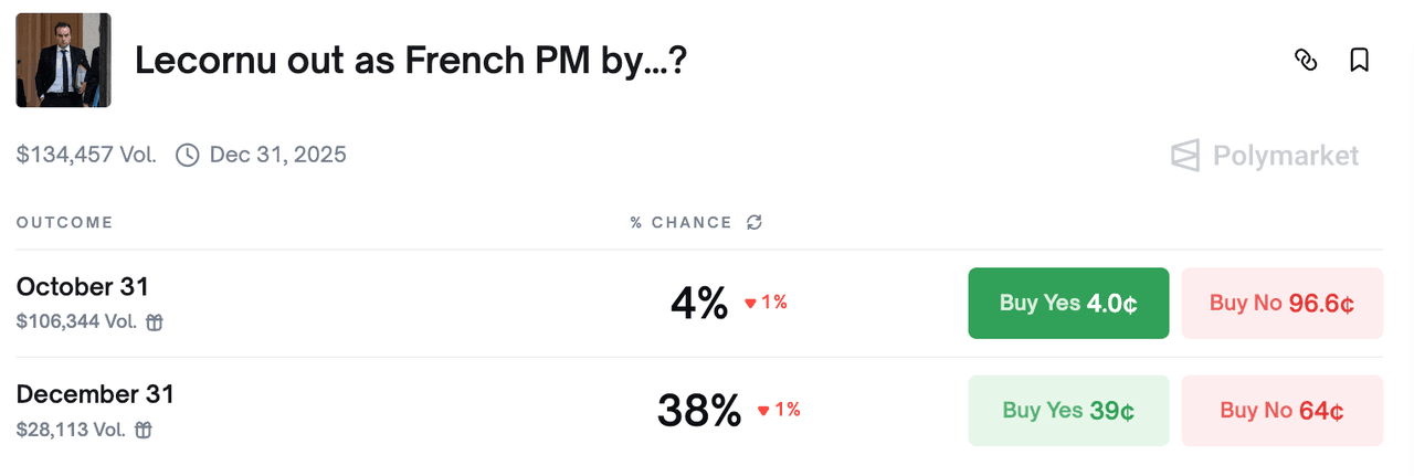 The latest data from the cryptocurrency-based prediction market Polymarket shows that Lecornu’s odds of being ousted are 4% between now and the end of October, but rise to 38% by year-end.