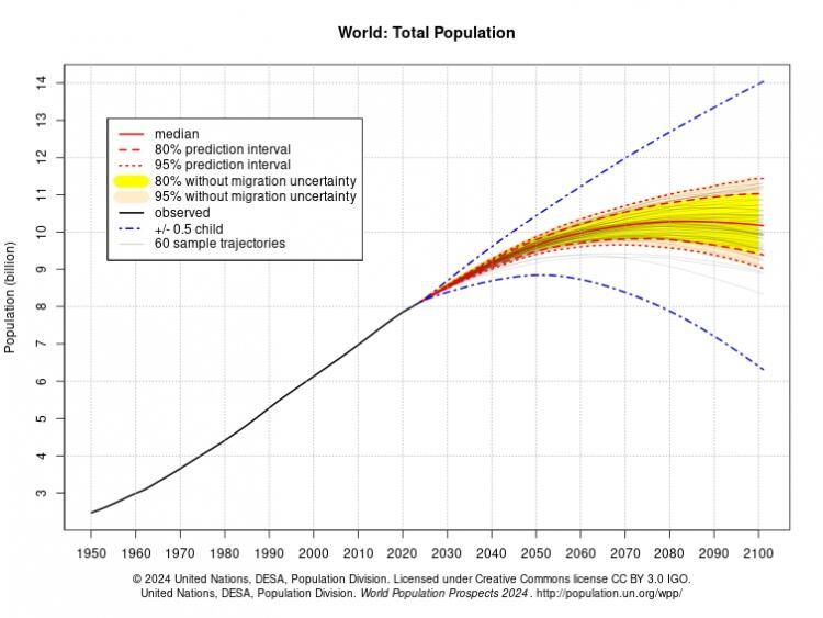 For example, while the U.N.’s median projection sees a peak at 10.3 billion in 2084, their model also includes a low-fertility scenario, in which the population peaks around 2060 at 9.5 billion and declines from there.