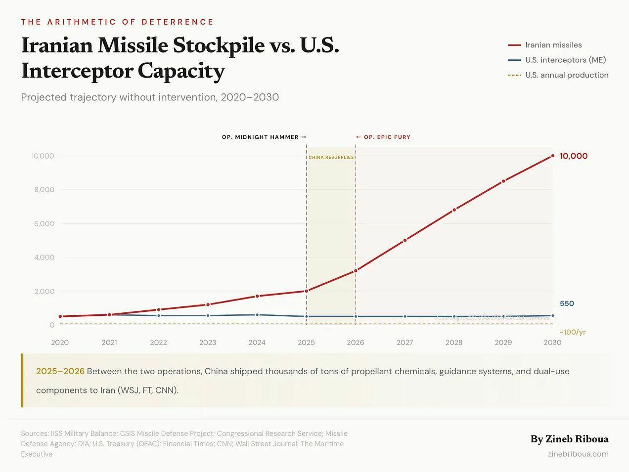 By the time Operation Epic Fury launched, Iran possessed the largest ballistic missile arsenal in the Middle East, an estimated 2,000 missiles of varying ranges dispersed across hardened underground facilities, rebuilt and resupplied in large part by Chinese industrial networks.