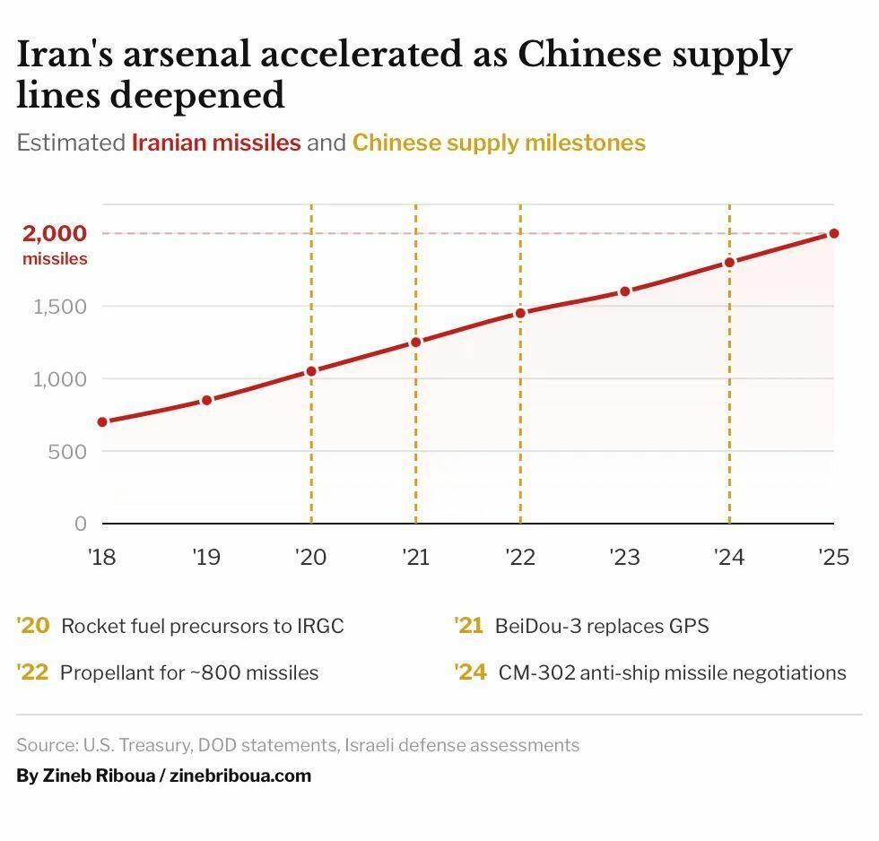 Over the past two years, China has emerged as the principal external supplier of Iran’s ballistic missile program, providing everything from chemical precursors for solid rocket fuel to satellite guidance through its BeiDou-3 navigation network, which replaced American GPS across Iran’s entire military architecture. The U.S. Treasury Department sanctioned several Chinese entities for supplying the IRGC with chemicals used in missile fuel production.