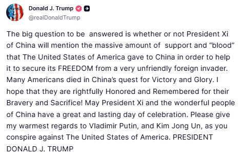 Trump also underscored America's WW2 defeat of Japan, which ultimately secured lasting peace for China. No, Xi did not give a shoutout to the United States for this, but instead Xi stood proudly with his US-sanctioned allies...