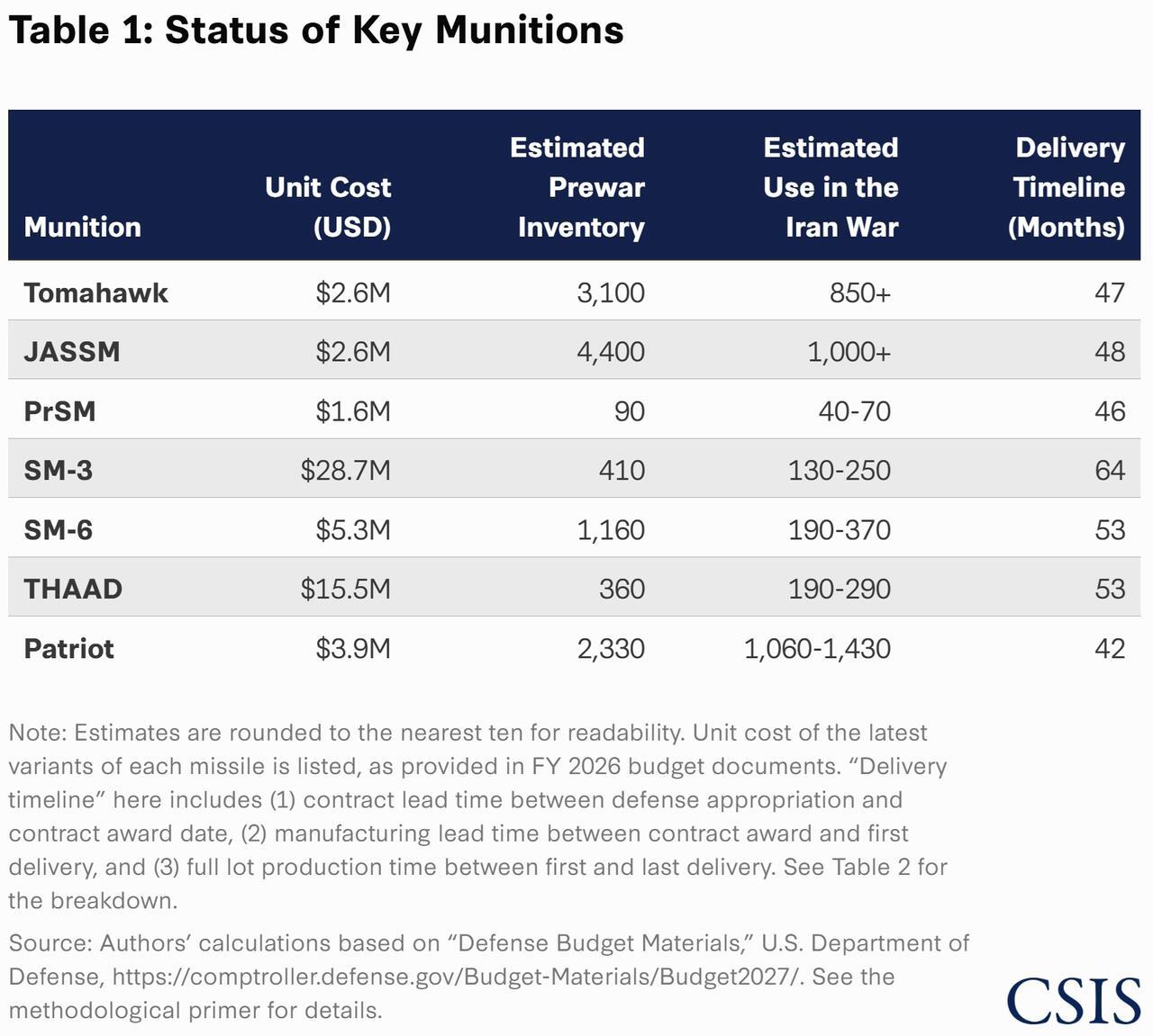 According to CSIS, the Pentagon burned through almost 50% of its Patriot missiles, more than half of its Terminal High Altitude Area Defense (THAAD) systems - designed to counter short, medium, and intermediate-range threats - and over 45% of its Precision Strike Missiles (PrSMs) during the Iran air and missile campaign.