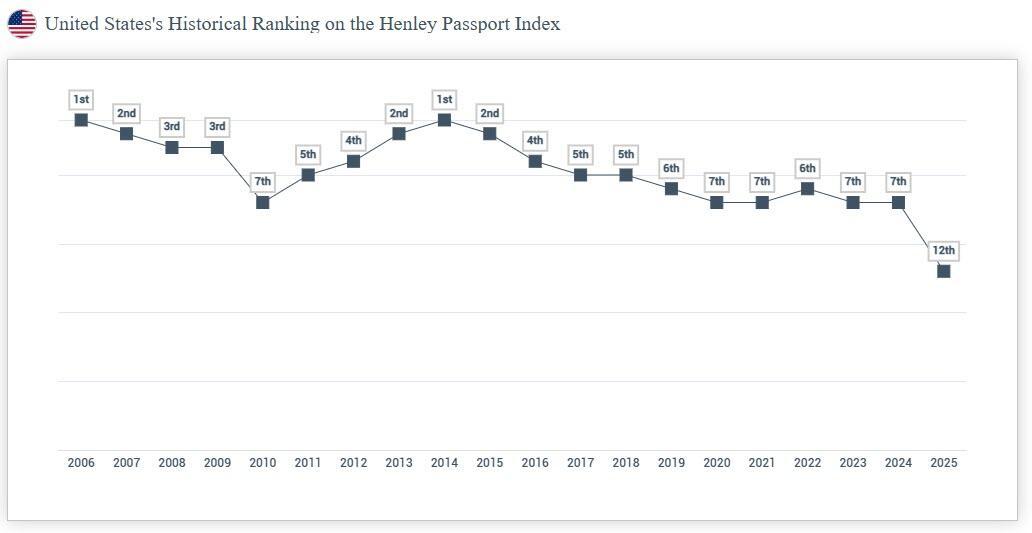 The United States has slid off the Top 10 most powerful passports for the first time since Henley & Partners started publishing their index 20 years ago.