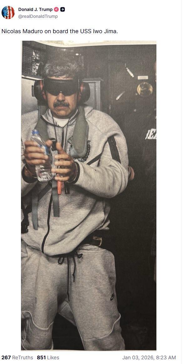 Additionally, President Trump has posted an image of Maduro on board the Iwo Jima, from which he will reportedly be transferred to an FBI plane at Guantanamo Bay heading to New York...