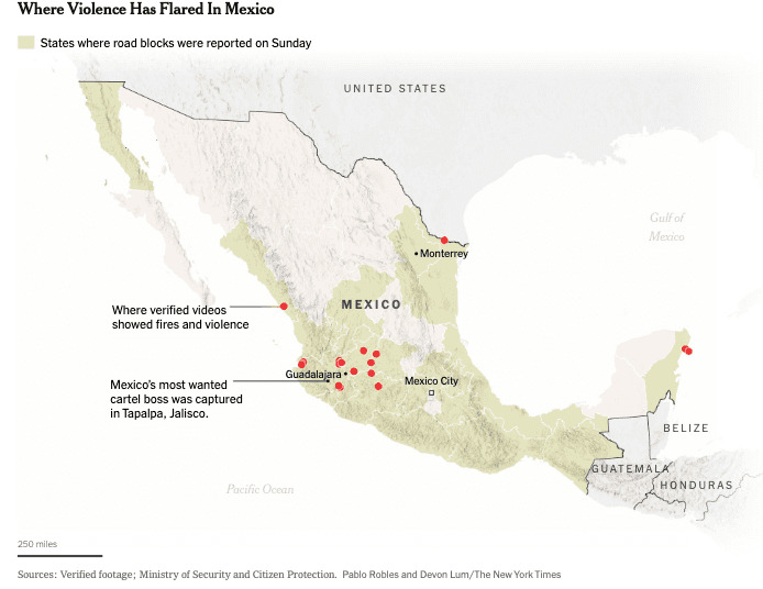 In response, the Mexican government deployed an additional 2,500 troops last night in Jalisco State and neighboring states. Combined with the 7,000 troops already stationed there, over 10,000 troops are now deployed to stop further CJNG attacks.