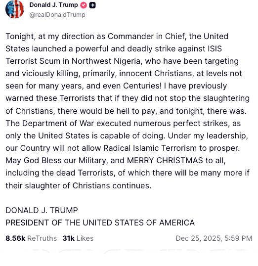 At the direction of the President of the United States and the Secretary of War, and in coordination with Nigerian authorities, U.S. Africa Command conducted strikes against ISIS terrorists in Nigeria on Dec. 25, 2025, in Sokoto State.