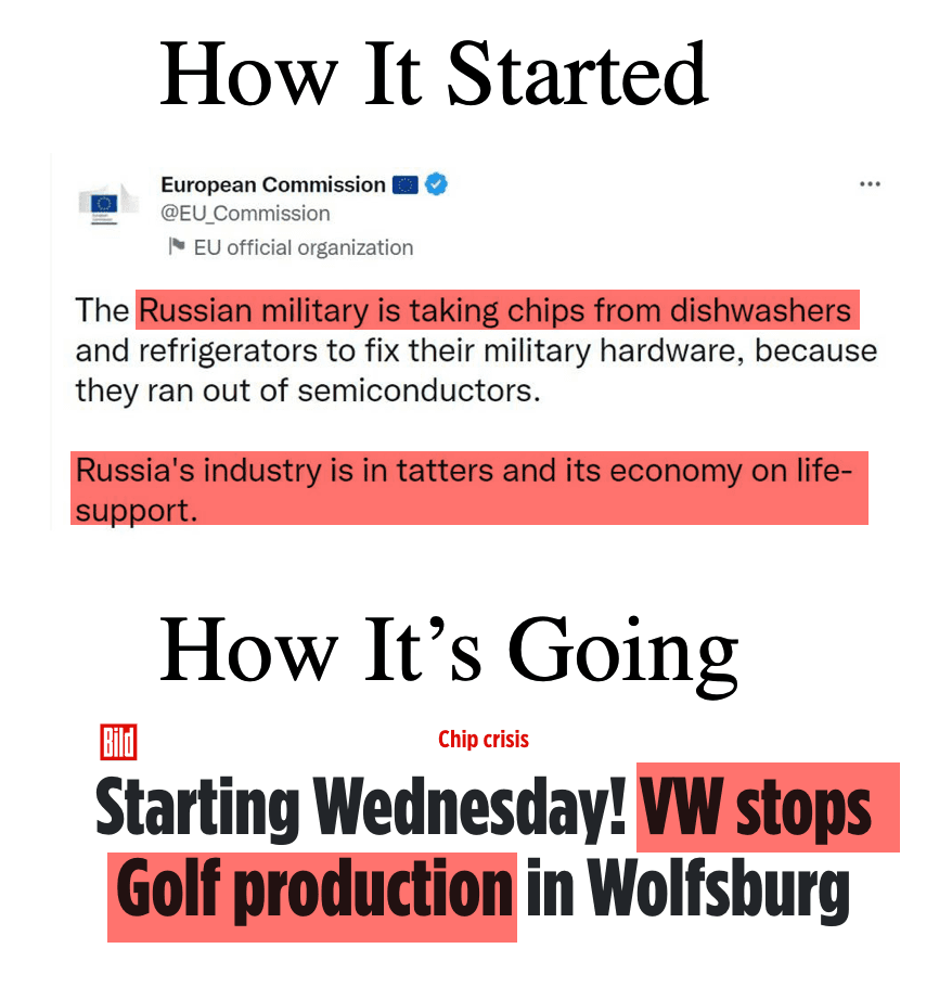 In 2022, European Commission President Ursula von der Leyen's State of the Union address bragged about "toughest sanctions the world has ever seen" against Russia which she claimed at the time, "Russia's financial sector is on life-support. We have cut off three quarters of Russia's banking sector from international markets" and "The Russian military is taking chips from dishwashers and refrigerators to fix their military hardware, because they ran out of semiconductors. Russia's industry is in tatters."
