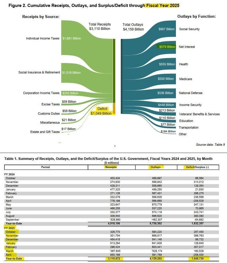 The GOP passage of $9.4 billion of DOGE cuts is nothing more than a PR stunt to convince the ignorant masses they are actually doing something about the deficit. The dopes making bets on Draft Kings and posting videos on Instagram have no concept about how ridiculously out of control our government has become. They add $6 billion to the national debt every single day, so their $9.4 of “cuts” will be gone in 37 hours. Our deficits are big, but they are not beautiful. Our deficit in FY24 was $1.8 trillion. Through the first 7 months of FY25 the deficit is $1.049 trillion. At the current rate of spending, the deficit will be $2.2 trillion by the end of the fiscal year.
