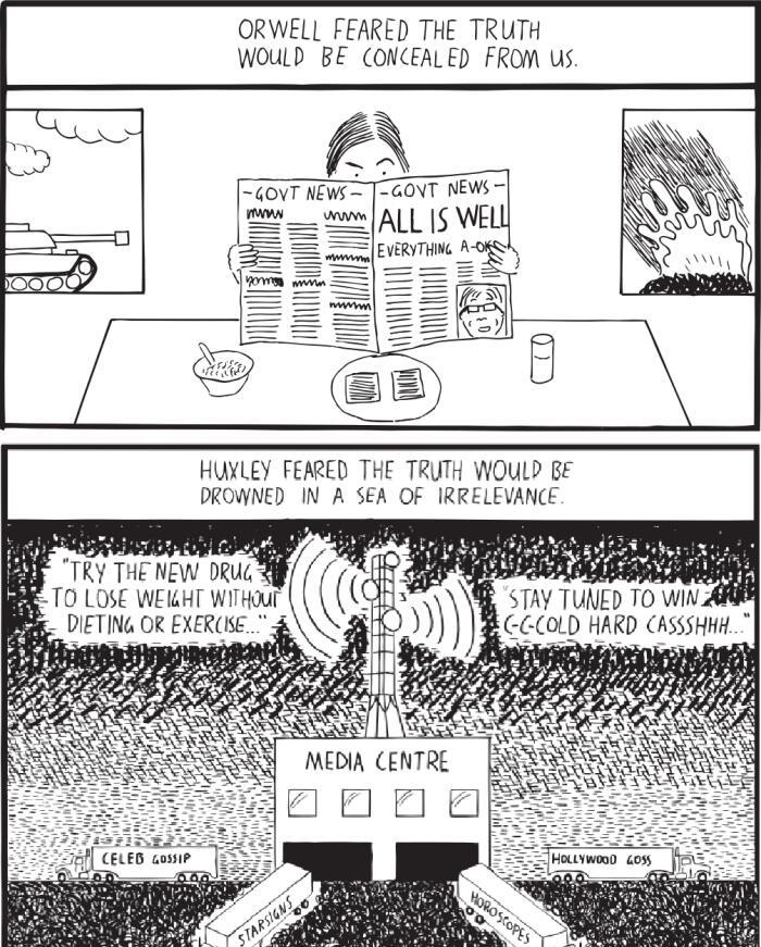“What Orwell feared were those who would ban books. What Huxley feared was that there would be no reason to ban a book, for there would be no one who wanted to read one. Orwell feared those who would deprive us of information. Huxley feared those who would give us so much that we would be reduced to passivity and egoism. Orwell feared that the truth would be concealed from us. Huxley feared the truth would be drowned in a sea of irrelevance. Orwell feared we would become a captive culture. Huxley feared we would become a trivial culture, preoccupied with some equivalent of the feelies, the orgy porgy, and the centrifugal bumblepuppy.” – Neil Postman – Amusing Ourselves to Death