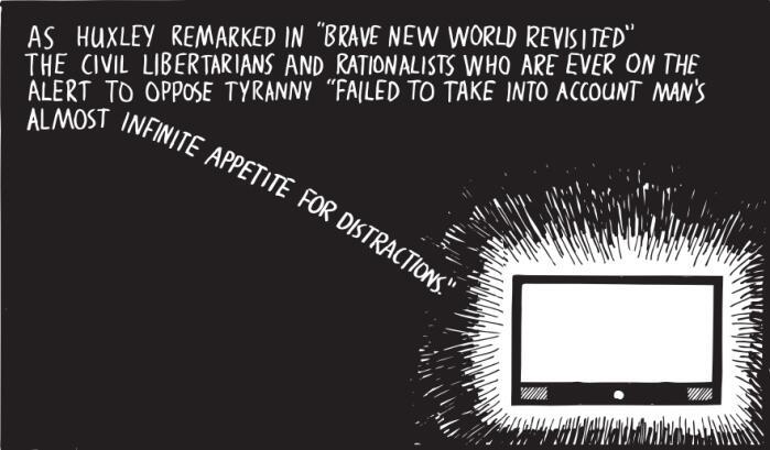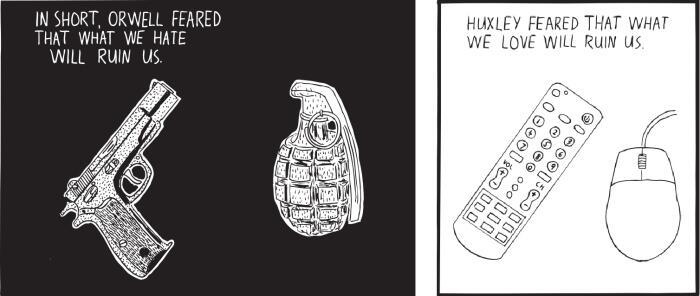“But we had forgotten that alongside Orwell’s dark vision, there was another—slightly older, slightly less well known, equally chilling: Aldous Huxley’s Brave New World. Contrary to common belief even among the educated, Huxley and Orwell did not prophesy the same thing. Orwell warns that we will be overcome by an externally imposed oppression. But in Huxley’s vision, no Big Brother is required to deprive people of their autonomy, maturity and history. As he saw it, people will come to love their oppression, to adore the technologies that undo their capacities to think.” – Neil Postman – Amusing Ourselves to Death