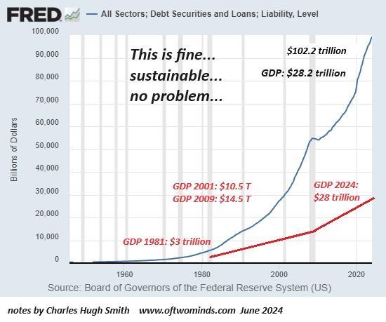 The problems generated by aging populations and declining birthrates are also shared by many nations. The same is true of rising debt levels, both public and private, which threaten to destabilize economies via either ruinously high inflation or fiscal frugality, i.e. austerity. Here is total credit in the U.S., a sobering chart that mirrors the debt loads of many other nations--debt that is outstripping GDP and income as interest rates rise in the new era of global inflationary forces.