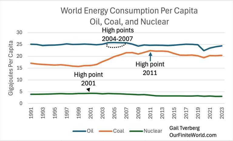 One of the underlying problems facing the world economy is the fact that major types of energy supply have been falling relative to world population for a long time. The high points seem to have been in 2004-2007 for oil, in 2011 for coal, and in 2001 for nuclear (Figure 4).
