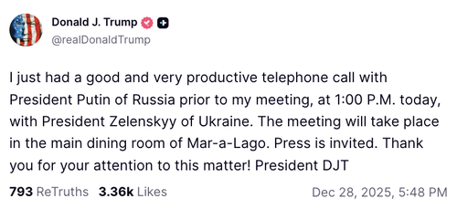 Things aren't looking ideal for a finalized peace plan, also given that Zelensky during a Christmas Day message essentially wished for Putin's death.
