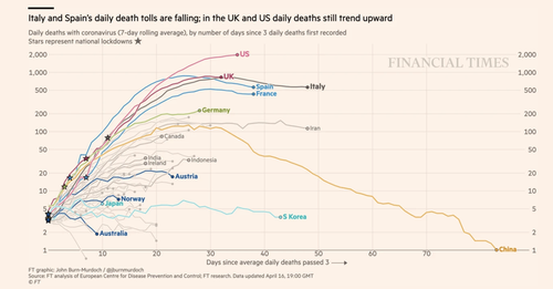 On Friday, Spain reported 5,252 new infections, the most significant jump in cases in more than a week, pushing up total cases to 184,948, with 19,478 deaths. The surge in cases could suggest that curve flattening via strict social distancing measures are not working, hence why the government has called up the military to conduct aerial disinfectant spraying missions.