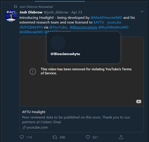 Here's a screenshot of Aytu CEO Josh Disbrow sharing the now-removed YouTube video, while tagging the now-banned Twitter account.