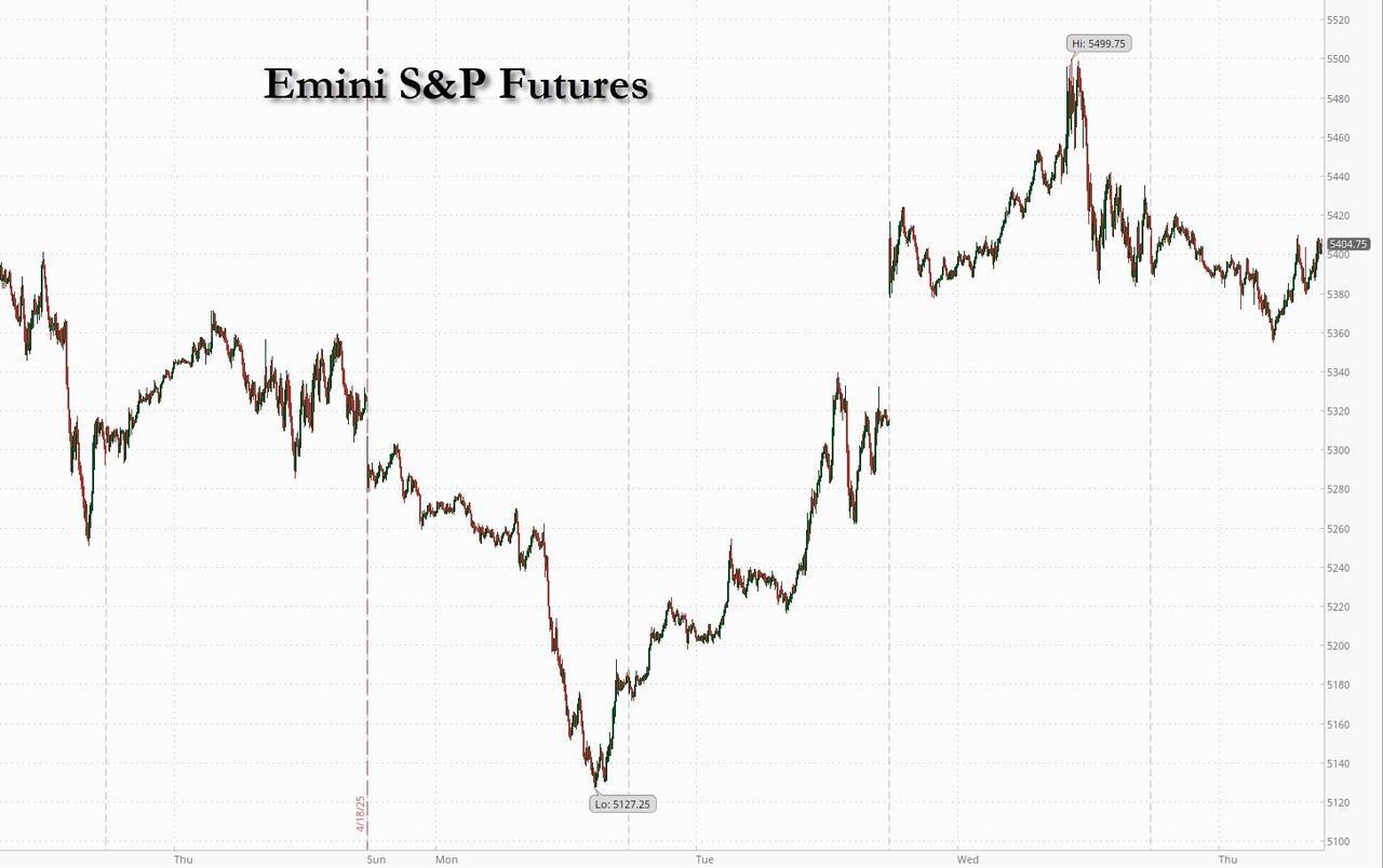 It's risk-off price action this morning, with US equity futures lower, rates rallying across the curve, macro credit opening softer, while the USD trades broadly lower. The two-day rally in US stocks fizzled amid mixed Trump signals on China tariffs as the president floated a fresh levy timeline while simultaneously denying easing efforts and Beijing called for full rollback of all US duties. As of 8:00am S&P futures slipped -0.3% as China maintained a defiant stance over tariffs imposed by Trump, but were off session lows as investors continue to live headline to headline; Nasdaq futures dropped 0.2% with all Mag7 names in the red; NVDA (-1.5%), TSLA (-1.6%), and AAPL (-1.2%) are leading the losses. With Trump reigniting tariff volatility, IBM warning on federal cuts and China denying trade talks entirely, the rotation out of US risk remains intact. Europe was mixed, Real Estate (+1.16%) and Autos (+0.71%) outperforming but Banks (-0.76%) and Travel (-0.69%) lagged. Overnight, China responded to the recent headlines regarding “US-China talk”: Beijing pointed out that “there are absolutely no negotiation on the economy and trade between China and the US and called to cancel all the unilateral measures on China. Meanwhile Trump downplayed the idea of millionaire tax rate, one that some Republicans sees as a way to pay for the economic package. Bond yields are lower and USD is weaker; 2-, 5-, 10-yr yields are 4.5bp, 4.8bp, 3.3bp lower. The dollar extended its decline (-0.56%), with gold climbing (+1.3%) as investors hedge against prolonged US policy risk. VIX is flat (+0.28%), MOVE dipped (-1.48%) and USYC2Y10 (+1.6%) suggesting caution is returning despite the bounce in crude (+0.74%) copper (+0.57%) and gold (+1.4%). Flows are risk-off: SPY -$1.98B, QQQ -$689M and IWM -$614M, while GLD picked up another +$643M and XLU +$109M. Looking ahead today, we have durable good orders, initial and jobless claims, existing home sales, as well as non-voter Kashkari speaking.