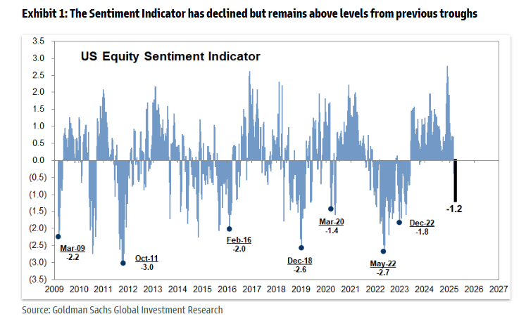 Goldman's US Equity Sentiment Indicator of investor positioning declined further this week to -1.2, the lowest reading since April 2023, but remains above levels typically reached at the trough of other major drawdowns during the past 15 years.