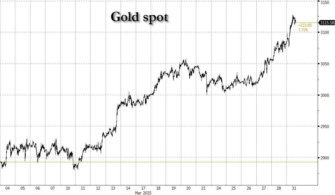 US equity futures and global markets tumbled on the last day of the worst quarter for US stocks in 23 years as the April 2 "liberation day" comes into sharp view. As of 8:00a, S&P futures are down 1.1% after Trump dented hopes he would limit the initial scope of levies set to be unveiled on Wednesday, telling reporters aboard Air Force One he plans to start with “all countries" leading to Goldman promptly slashing its S&P price target for the second time in weeks, now seeing the index dropping to 5300 in 3 months; Nasdaq futures tumbled 1.6% driven by heavy selling of the Mag 7 stocks (NVDA -3.2% and TSLA -4.1%). It wasn't just the US: Europe's Stoxx 600 slid 1.2% and Asian stocks suffered sharp losses, with the Japan’s Nikkei 225 index losing 4% and Taiwan’s stock index falling into a correction. Bond yields are 4-7bps lower; the USD was lower at first but has since rebounded . Commodities rise across the board: gold trading up 1.1% to a new record high of $3120, with base metals mostly higher, and Brent above $74. This week, all eyes are on April 1st (all studies related to trade policy will be completed) and April 2nd (reciprocal tariff announcement, sectorial tariffs such as pharma, semis and commodities, the resumption of 25% tariffs on USMCA-compliant goods). We will also receive ISMs and NFP this week.