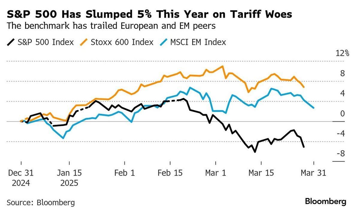 The risk that tariffs will hurt the global economy has propelled the S&P 500 to a 5.1% plunge in the first quarter, which would be the worst since 2022, and wiped about $5 trillion off the value of US equities since late February.