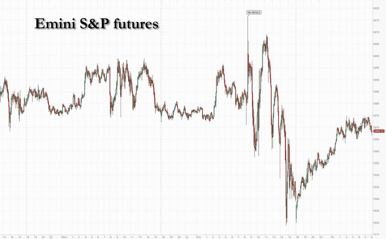 S&P 500 futures rose 0.4% as Tesla shares rebounded 4% in premarket on signs that the spat between President Donald Trump and Elon Musk is cooling. Market gains had little conviction as traders brace for Friday’s main event: a pivotal payrolls report (full preview here) that’s likely to set the direction of travel for markets. Nasdaq futures also add 0.5% even as Broadcom shares fall 3% in premarket after giving a a lackluster revenue forecast for the current quarter. European stocks are little changed. Bond yields are 1-2bp lower; the USD is higher; the yen dropped after BBG reported that Bank of Japan officials are likely to discuss slowing their pullback from buying government bonds at a policy meeting later this month. Commodities are mostly higher: Gold climbs $6 to around $3,358/oz while silver tops $36/oz. WTI falls 0.6% to $63 a barrel. Bitcoin rises 3%. Macro headlines were largely muted overnight; All eyes on NFP today.