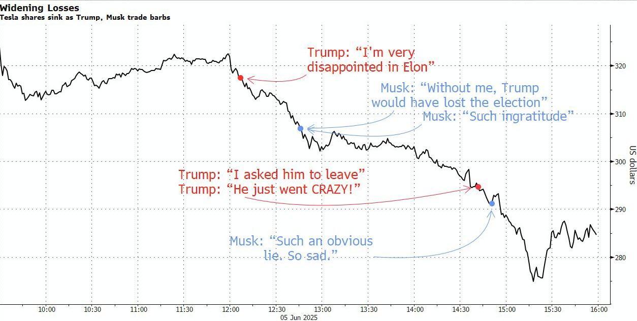 Markets are still reveberating from the spat between Trump and Musk in which Trump proposed cutting off the billionaire’s government contracts. Musk, who sparked the public feud by criticizing Trump’s signature tax bill, later signaled that he’s keen to dial down the hostility. White House aides have reportedly scheduled a call with the world’s richest person for Friday in an effort to cool things down. Their public back-and-forth triggered the most spectacular real-time destruction of wealth ever, with $34 billion erased from Musk’s net worth. Tesla shares are rebounding in premarket, after tanking 14% Thursday.