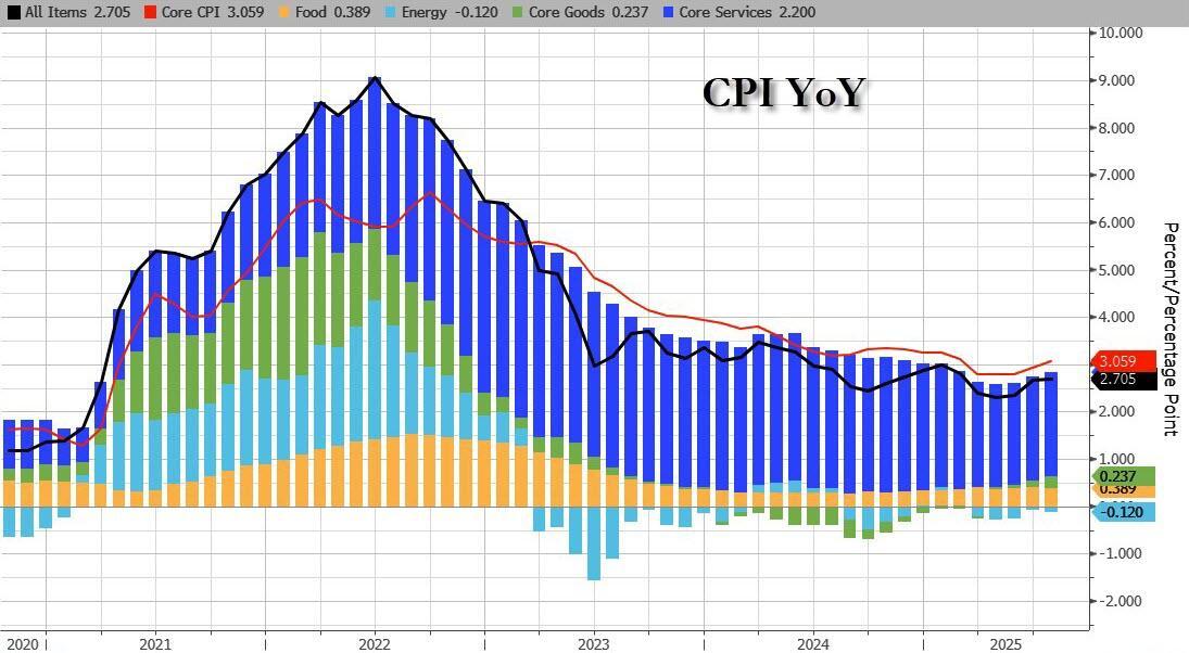 US equity futures have a slight bid into today's CPI print - the last key macro datapoint ahead of next week's rate decision - rising to another daily record high, let by Tech. As of 8:10am, S&P futures rise 0.2% after back-to-back all-time highs while Nasdaq 100 futures rise 0.3% with AAPL and AMZN leading the Mag7 higher and ORCL +1.4% after its +36% move yesterday. In a familiar pattern this week, Cyclicals are outperforming Defensives pre-mkt. European stocks also drifted higher while Chinese stocks capped their biggest advance since March, led by companies seen as major beneficiaries of the nation’s push for homegrown technology. Treasuries held steady, with the 10-year yield at 4.05%; the USD is up small as the yen slumps after prominent LDP dove and conservative Sanae Takaichi said she is running for PM; commodities are seeing some profit-taking with both Energy and Metals lower. CPI and Jobless Claims are the focus for today as investors solidify views into next week’s Fed as well as Oct / Dec meetings.