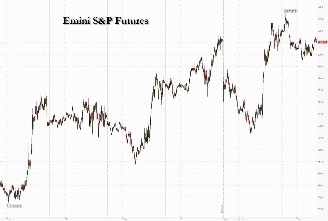 US equity futures are weaker with Tech underperforming, threatening a six-day winning streak that propelled the S&P 500 to the brink of a bull market. Then again, Monday started off even worse and then we saw the biggest burst of retail buying on record resulting in one of the biggest intraday reversals in recent history (according to JPM, more here), so brace for more unexpected moves. As of 8:00am ET, S&P futures are down 0.2%, while Nasdaq 100 futs drop 0.3% with Mag7 stocks mixed amid weakness in semis into today’s Google I/O developer conference; healthcare is leading Defensives over Cyclicals. The yield curve is twisting steeper with the 10Y yield flat and USD weakening. Commodities are mixed with crude down, natgas up, base metals down, precious up, and Ags generally higher. Macro data is light, with just the Philly non-mfg PMI on deck ahead of Thursday’s Flash PMIs & Claims prints, but we have another round of Fed speakers where the message continues to be patience.