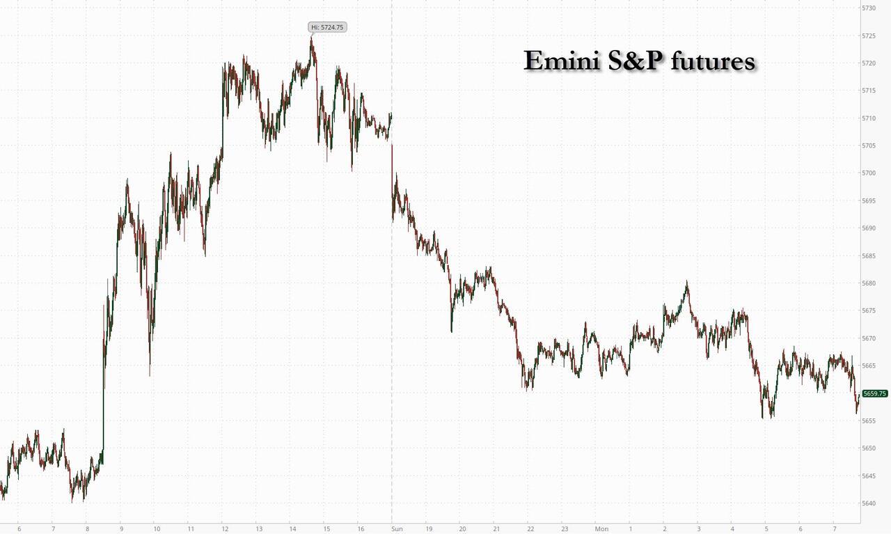 US equity futures are lower after the S&P gained 2.9% last week and erasing all post-Liberation Day losses. As of 8:00am, S&P futures were down 0.9%, putting the index on track to snap its longest streak of gains since 2004; Nasdaq futures dropped 1.0% with the Mag7 weaker, pulling markets lower, and cyclicals under pressure. Berkshire Hathaway stock is down 2% after Warren Buffett surprised Berkshire’s annual meeting on Saturday by announcing that he plans to step down at the end of the year. Overnight, Trump’s latest flurry of tariff comments gave little clarity on the path forward for markets: the president suggested some deals could come as soon as this week, but also that he had no current plans to speak with Chinese President Xi Jinping; he also said that a trade deal may come as soon as this week (India? Japan? S Korea?). Trading outside the US has been subdued to start the week, with several financial market including Japan, Hong Kong, China and the UK, closed today. The USD is weaker and bond futures are flat around 4.30%. Crude oil slumped after OPEC+ announced it is increasing supply (411k bpd), hurting oil prices but providing a disinflationary offset to tariff. Today’s macro data focus is on ISM-Services with the Fed on Weds.