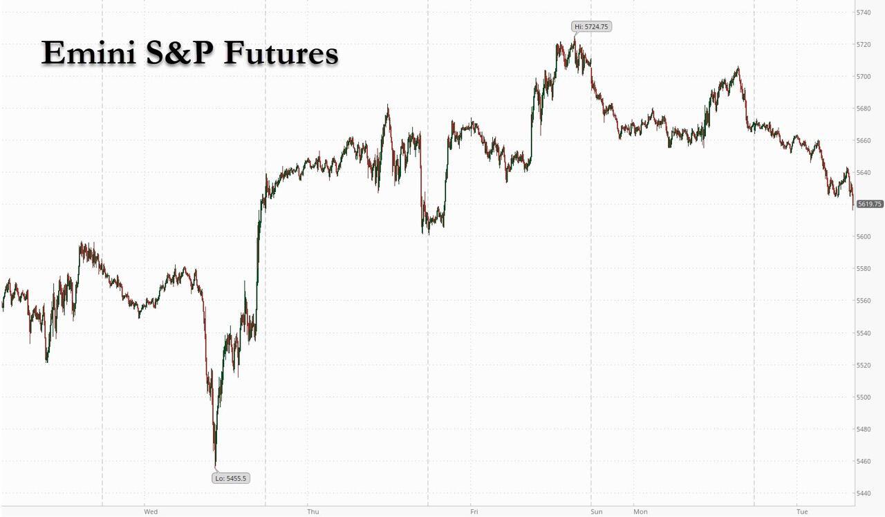 US equity futures slumped for the second day, dragged down by earnings and a lack of positive news on trade negotiations. As of 8:00am, S&P 500 futures dropped 0.9% as risk is pared into tomorrow's Fed announcement and the index failed to breach through technical resistance; Ford slumped after suspending its guidance and warned tariffs will reduce 2025 adjusted EBIT by about $1.5 billion; Nasdaq futures 100 dropped 1.1%, with all Mag7 stocks lower as Tesla and Meta led declines. Palantir tumbled 8% after the software firm’s results failed to meet investors’ expectations, while Ford slipped 3% after the carmaker pulled its financial guidance and flagged a tariff impact of about $2.5 billion on 2025 earnings. German stocks tumbled Estoxx 50 after incoming German chancellor Friedrich Merz suffered a shock setback when he fell short of a majority in an initial vote in the lower house of parliament to confirm him as Germany’s next chancellor. The yield curve is twisting steeper as USD comes for sale. Commodities are higher with WTI crude oil futures rebounding more than 2% from Monday’s YTD low close and gold is marching back to its ATHs. Trade Balance data is the macro data focus.