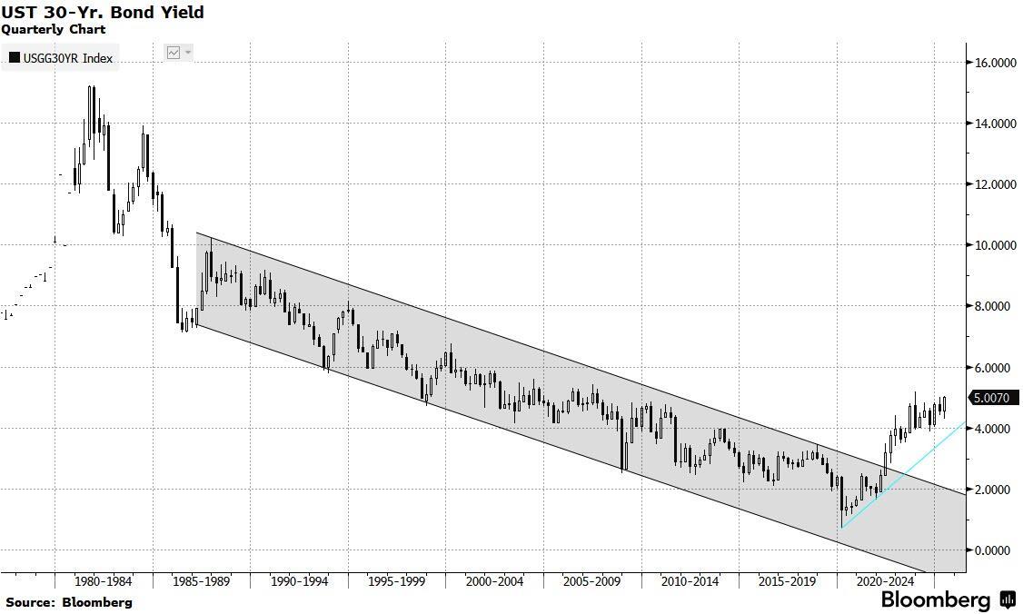 Besides the sellin in stocks, we have also seen a concurrent slide in rates, with 30-year Treasury yields hitting 5.03%, at the highest since November 2023. As Bloomberg notes, the 30-year yield is in an uptrend since the March 2020 low, broke the long-term channel downtrend dating back to 1987 peak in December 2022.