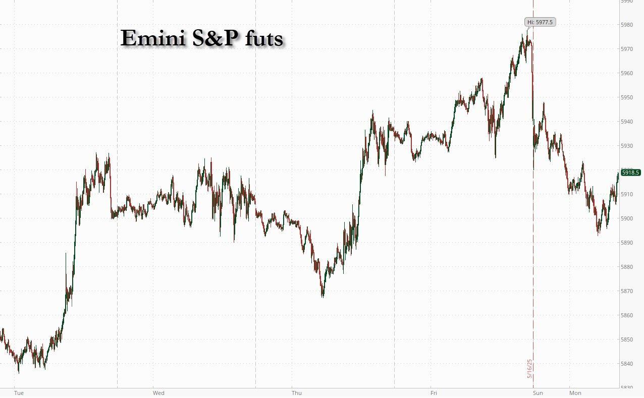 US equity futures and bond yields are sharply higher across the curve as market react to Moody's greatly delayed downgrade to US credit on Friday (it follows 14 years after S&P did the same in August 2011), with the USD trading broadly lower, gold higher and macro credit trading notably wider. As of 8am ET, S&P 500 contracts fell 1.0% and Nasdaq 100 futures down 1.4%, with investors cooling on equities after a five-day winning streak, and up 7 of the past 8 days. Pre-mkt, MegaCap Tech names are down 2-4% with Semis/Cyclicals under pressure. European and Asian shares also dropped. The yield curve is bear steepening with the 30Y yield surpassing 5% and hitting its highest level since Nov 2023 and the USD selling off: the euro rose as much as 1.1% as all major currencies advanced against the greenback. Commodities are mixed with energy/base lower and precious/ags higher. Looking ahead today, there are no major economic data releases. Fed voters Williams, Jefferson, and non-voters Logan, Kashkari and Bostic are scheduled to speak today.