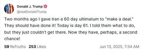 - US President Trump posts on Truth "I gave Iran chance after chance to make a deal" and "Iran must make a deal, before there is nothing left, and save what was once known as the Iranian Empire".