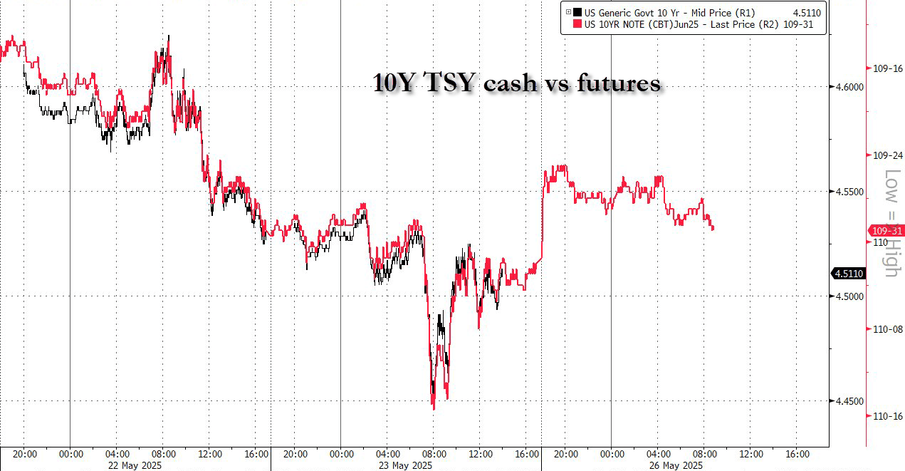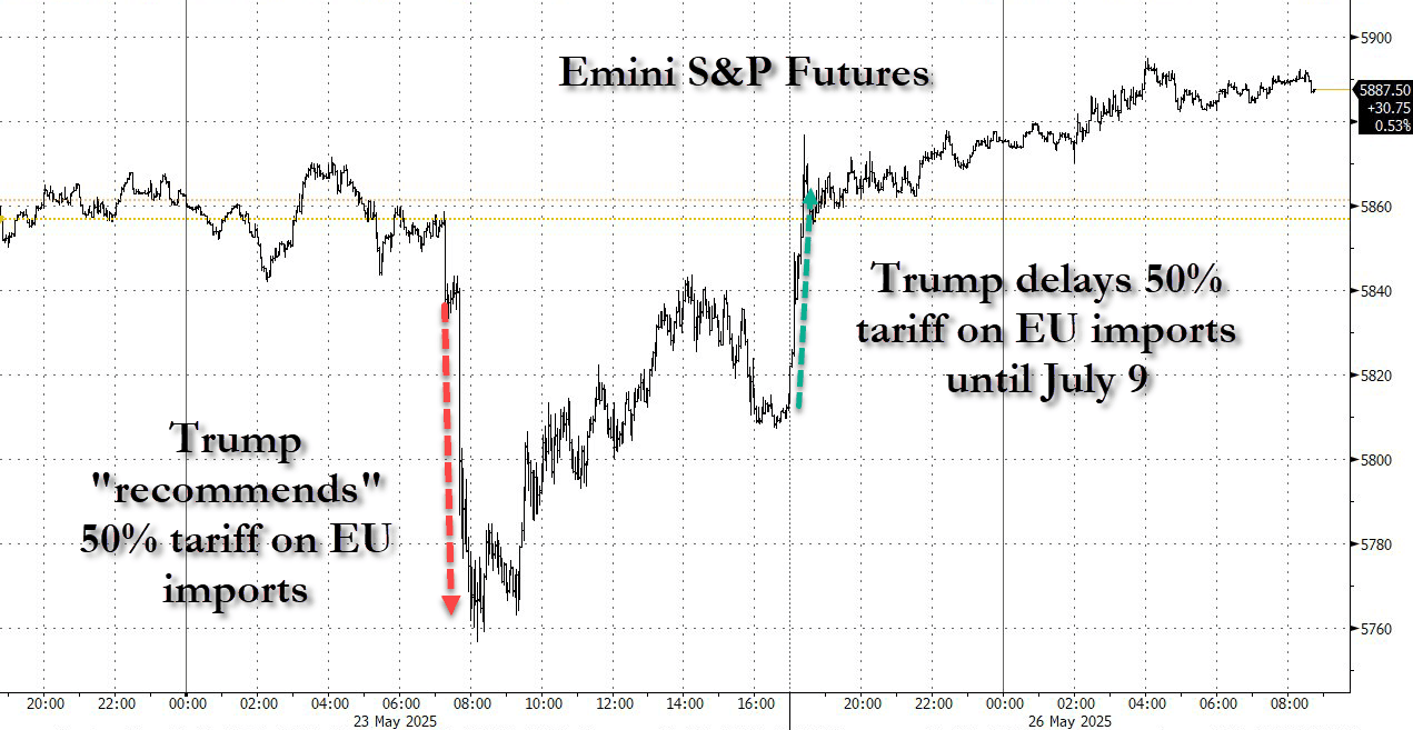 US equity futures surged and European stocks climbed after President Donald Trump extended a deadline on aggressive euro area tariffs, reinforcing the pattern of leaving markets guessing and flip-flopping by making trade threats before backtracking, all in keeping with the gamebook established during the Trump 1.0 trade wars. With US cash markets closed for Memorial Day, US equity futures jumped 1.2% and Nasdaq 100 futures surged 1.4%, erasing all of Friday's losses.