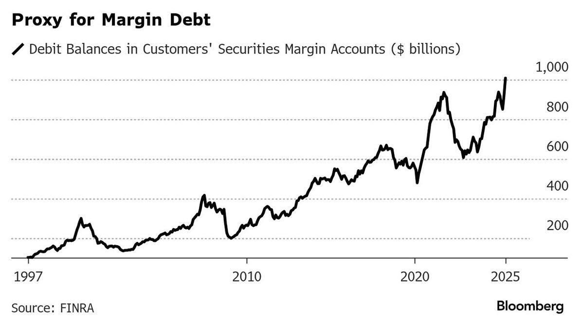 Bubbly valuations are also giving BofA's Michael Hartnett pause, although there are no signs of a reversal yet and the S&P 500 is set to notch a third month of solid gains. Hartnett warned of a “bigger retail, bigger liquidity, bigger volatility, bigger bubble” as global central banks ease policy and governments loosen financial regulation. US margin debt is starting to run too hot — a potentially concerning sign for the credit market, according to Deutsche Bank credit strategists. As shown below, brokerages have extended a record $1 trillion in margin credit to clients in June.